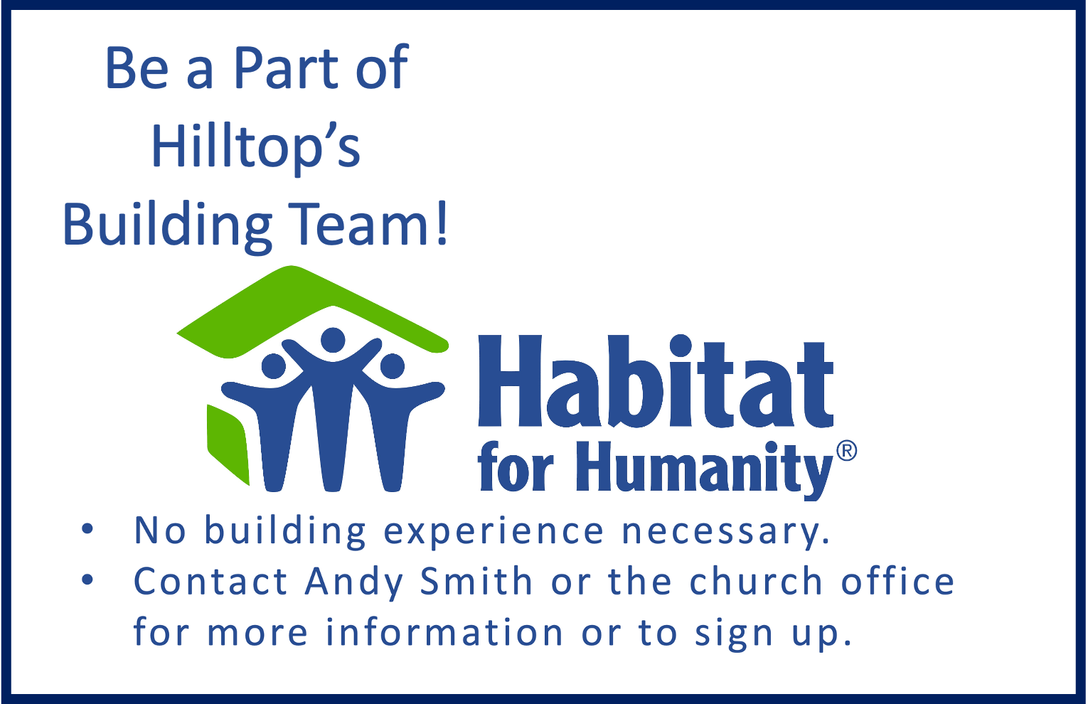 Habitat for Humanity Build Saturday, June 27, 2026 8:00 AM 5:00 PM Hilltop House 14 Hilltop Rd Mendham, NJ (map) Google Calendar ICS Join the Hilltop Church Habitat build team for a rewarding day of service. If you’re interested, contact the church office at (973) 543-4012 or office@hilltopchurch.org